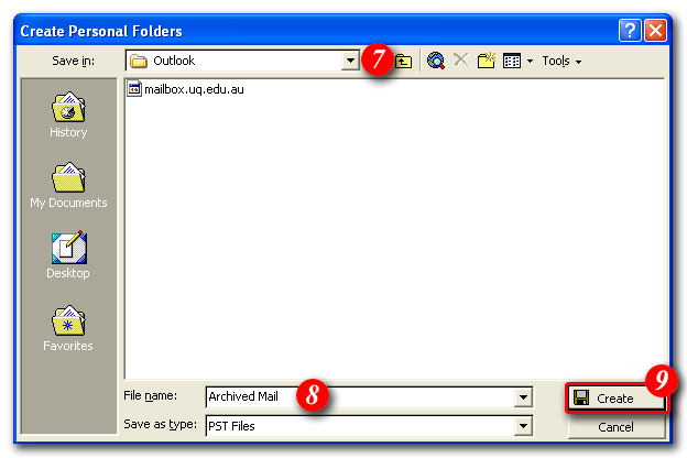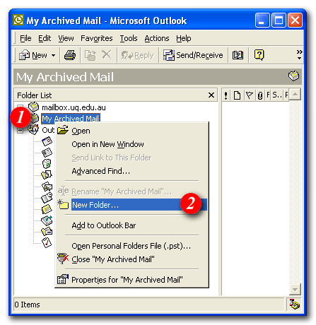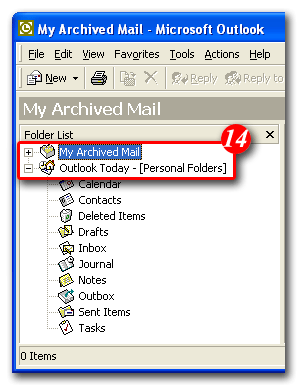 14)Outlook will now return to the main screen and your personal folder will be visible in the folders list on the left. (Note: this example now shows two personal folders - The original 'Personal Folders' that was present at the start of the exercise, and a new 'My Archived Mail' folder that was just created) You can setup as many personal folders as you need to manage your mail effectively. Most people find that one personal folder with a number of sub-folders underneath it is the best way to go. For assistance creating sub-folders please click here.
